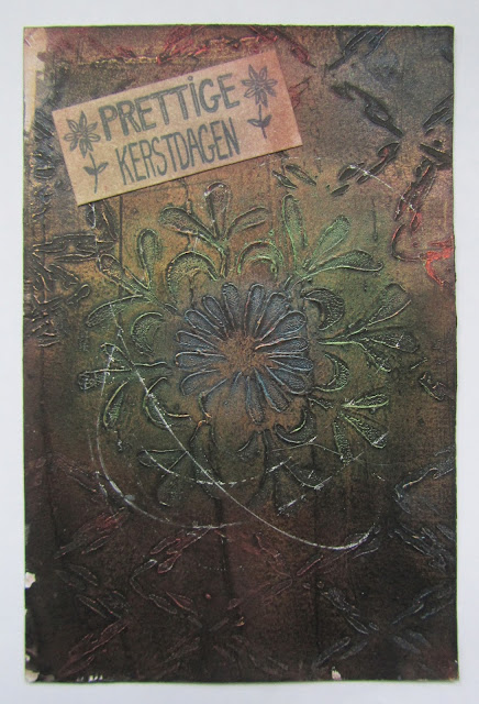 Ook deze kaart hier en daar bewerkt met gesso. dan de blokjes uit een vel van Jane Davenport Mixed Media Collage Papers gescheurd. Opgeplakt met matte gelmedium. Daar weer hier en daar met gesso overheen. Deze omlijnd met zwarte en witte Uni Posca pen. Love geschreven, geprikt en de gaten omlijnd met een zwart aquarelpotlood. Dit met water nat gesprayed, uit laten lopen, gedroogd en toen geborduurd met rood garen. De tekst gestempeld met een stempel waarvan je de letters kunt draaien en er zo woorden mee kunt maken. (gekocht op een scraprommelmarkt bij De Scrapheap). Als laatste nog wat zwarte en rode verfspetters!
