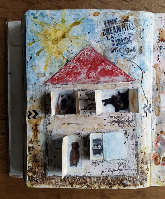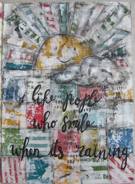 Hier heb ik eerst de achtergrond bewerkt met gesso. Daar over drie kleuren Dylusions sprayinkt. De letters getekend op aquarelpapier, uitgeknipt en beplakt met Jane Davenport Mixed Media Collage Papers. De tekst you gemaakt met oude rubons! Deze, de letters en de kaart met zwarte en witte Uni Posca pen omlijnd. De letters opgeplakt met foamblokjes, daar omheen gaatjes geprikt en deze geborduurd met blauw garen. Als laatste nog wat blauwe verfspetters!